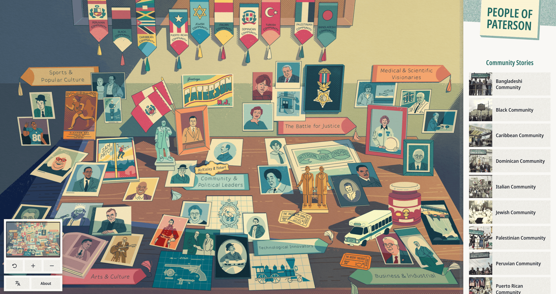 The illustrated backdrop features 55 portraits and artifacts that, when tapped, provide interpretation about the city's most notable stories. They are arranged in groups denoted by silk pennants, a visual motif that celebrates “Silk City's” history as a leader in the textile industry. This interface encourages visitors to browse freely while gaining an understanding of Paterson's history and diverse communities today.