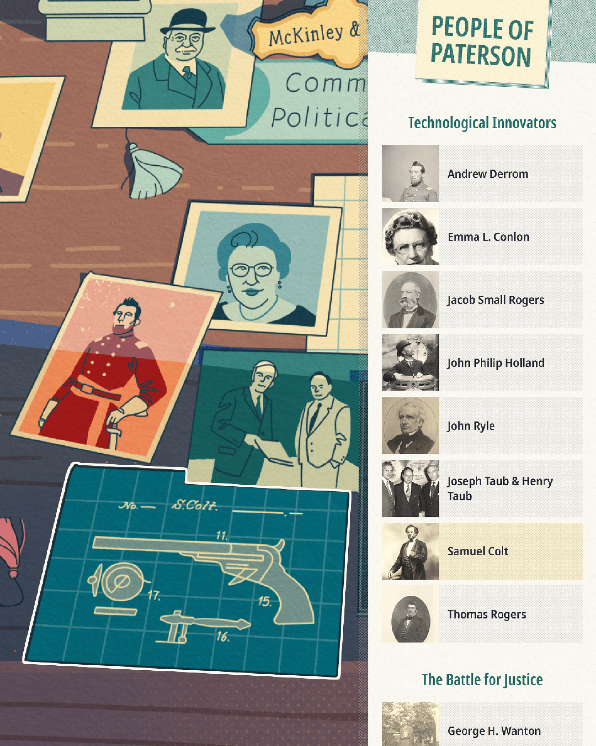 A visitor might learn about Samuel Colt and his development of the iconic Colt revolver through the mural, then encounter real artifacts of that invention elsewhere in the gallery. People of Paterson is a digital guide that is available on-site and online through the Paterson Partnership's website. Together, the mobile-responsive website and lightweight kiosk provide a portable, flexible gateway into the history of Paterson, New Jersey.